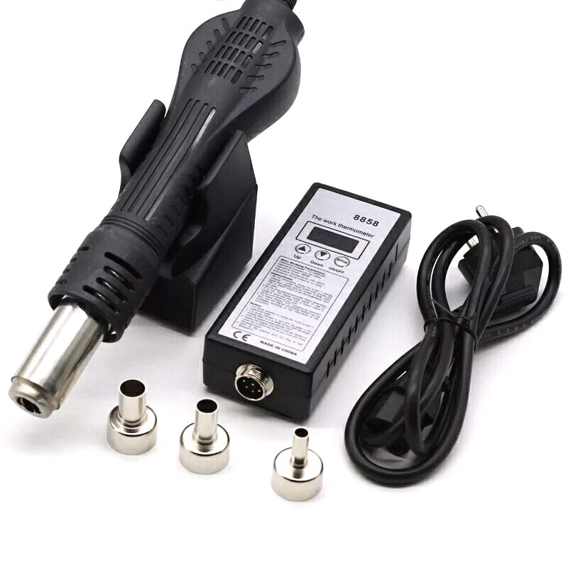 Далее была мысль изготовить данное устройство своими руками.Посмотрев по интернету как другие это делают решился на данный подвиг.Начал подбирать компоненты и уже начал изготавливать нагревательный элемент и корпус но в дело вмешался случай.Пришлось ремонтировать одно электронное устройство и там где при помощи паяльного фена можно было справиться за несколько минут с паяльником я провозился намного дольше и с весьма посредственным качеством.Это и было последней каплей, а "жаба" отодвинута на задний план.К тому же китайский бог видя мои мучения открыл неделю скидок на алиэкспресс и наградил меня в добавок каким то купоном на дополнительную скидку.С учётом выше изложенного я стал счастливым обладателем китайского паяльного фена JCD 8858. Обошёлся он мне с учётом всех скидок в 938 рублей что на мой взгляд очень дёшево.Диапазон температур 100-480C, диапазон скорости F1-F10 (10 вариантов) всё работает, со своими функциями справляется.Припаять или отпаять смд компонент не составляет труда.Со всеми регулировками разобрался довольно быстро.В комплекте сам фен с тремя насадками разного диаметра, блок управления, подставка под фен.Доставка была довольно быстрая курьером до двери.В общем рекомендую данную вещь к покупке,не сочтите за рекламу,но очень выручает данный инструмент.