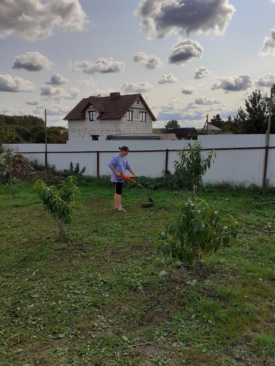 А день сегодня выдался отличный! Для средней полосы в сентябре это - самое настоящее молодое бабье лето. Золотая осень с шуршащей листвой ещё в пути и последние недели наслаждаемся созерцанием зеленых крон деревьев. Мы - классические "совковые" дачники, которые занимаются не поеданием шашлыков на природе, а земледелием. Конечно, для отдыха тоже находится время и отдохнуть очень приятно за чашкой чая на лужайке посреди сада: Но с утра сегодня мы косили в саду траву. Косили последний раз перед зимой, пока сухая погода. Я всегда стараюсь высокую траву в зиму не оставлять, иначе потом весной будет трудно убирать высокие пожухлые стебли. Участок у нас большой и за один раз всё не скосить, поэтому эту процедуру проводим в несколько приёмов. Солнце сегодня не пекло и к полудню я решила прорыхлить виноградник, так как на неделе прошли сильные дожди, а влага молодым кустам винограда сейчас не очень полезна (задерживает вызревание лозы): Кое-где ещё были остатки мульчи, но я её вкопала в землю