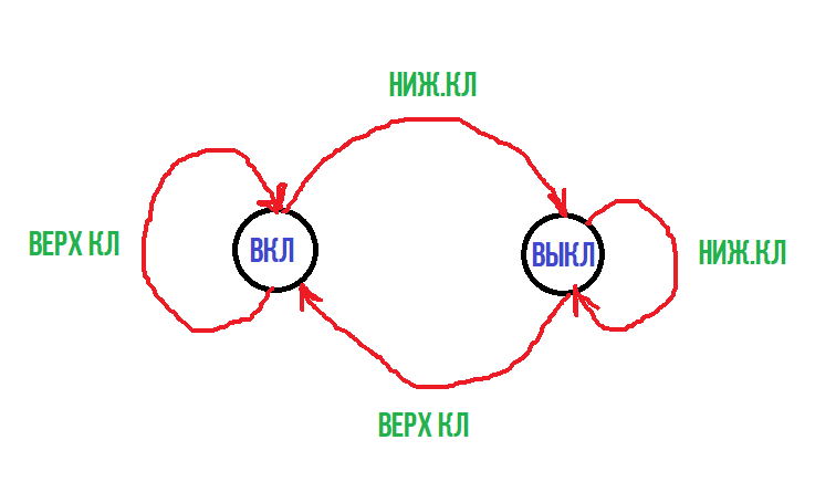 Аналогично и с выключением. При нажатии нижней кнопки выключатель переходит в состоянии выключено и подаёт управляющее воздействие на разрыв цепи. В результате лампа гаснет, а выключатель находится в состоянии выкл.