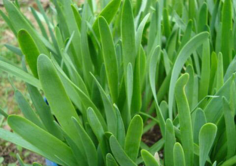 Отличается он от других овощных луков тем, что выпускает достаточно широкие плоские листья с округлыми концами. Правда, в первый год (при посеве семенами) образует куст из 2-х побегов и 4-5 тонких шилоподобных листьев. Со второго года число листьев в кусте увеличивается и они приобретают свою характерную форму. На четвертый-пятый годы выращивания их число может достигать 25-30 шт. в кусте. В дальнейшем количество листьев сокращается.