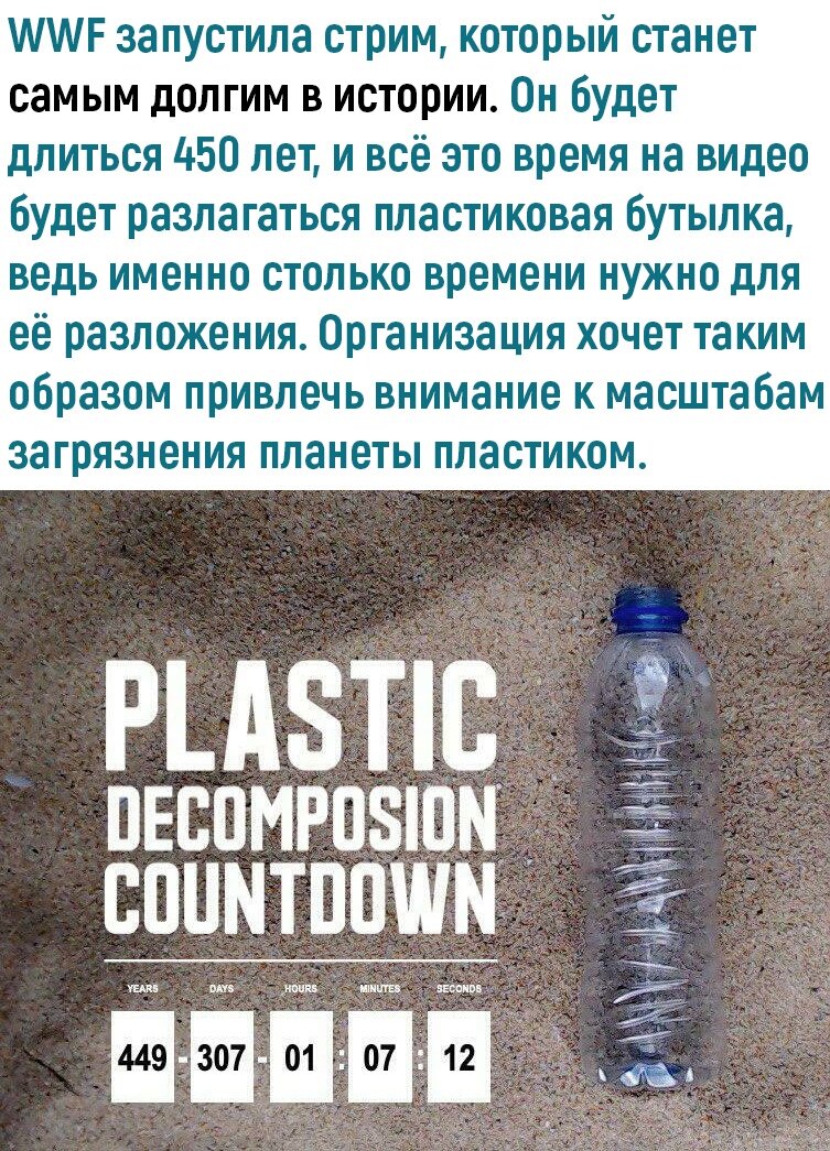 WWF запустил 450‐летний стрим с «разлагающейся» пластиковой бутылкой Всемирный фонд дикой природы нашел необычный способ достучаться до жителей планеты и властей тех стран, которые до сих пор используют пластик повсеместно в бытовых целях. 10 мая в 12.00 в Facebook была запущена онлайн-трансляция, показывающая, как платиковая бутылка «разлагается» в прямом эфире. По словам природоохранной организации, на полное разложение этой бутылки потребуется около 450 лет. Ровно столько и будет длиться стрим. На сайте трансляции все желающие, неравнодушные к жизни окружающей среды, могут подписать петицию с требованием остановить пластиковое загрязнение Земли. Более 500 тысяч пользователей Сети отнеслись к инициативе положительно и подписали документ.