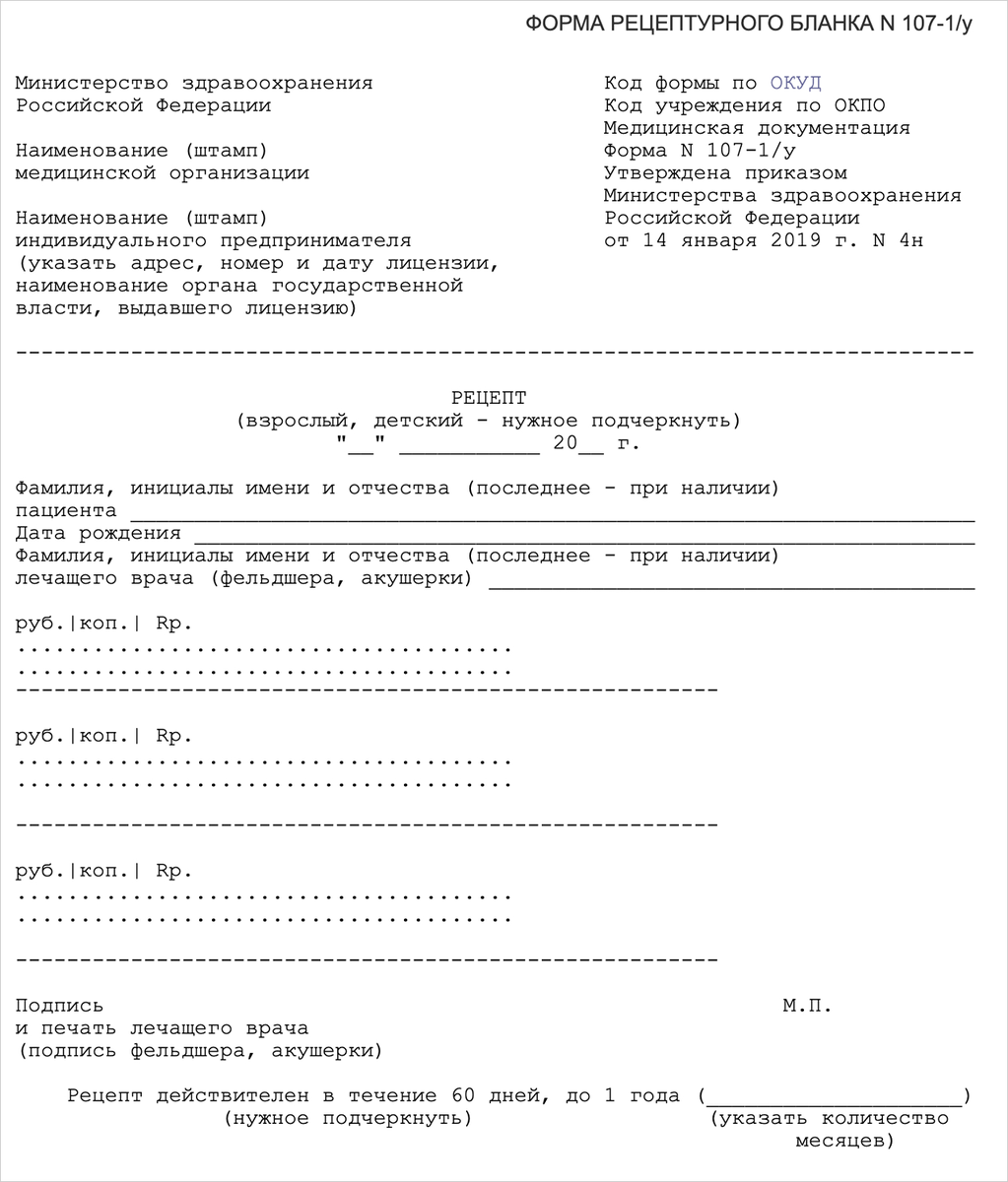 1. Врач должен выписать рецепт по форме № 107-1/у в двух экземплярах. Один бланк — для аптеки, второй — для вычета. В приказе упоминается форма № 107-у, но она утратила силу.