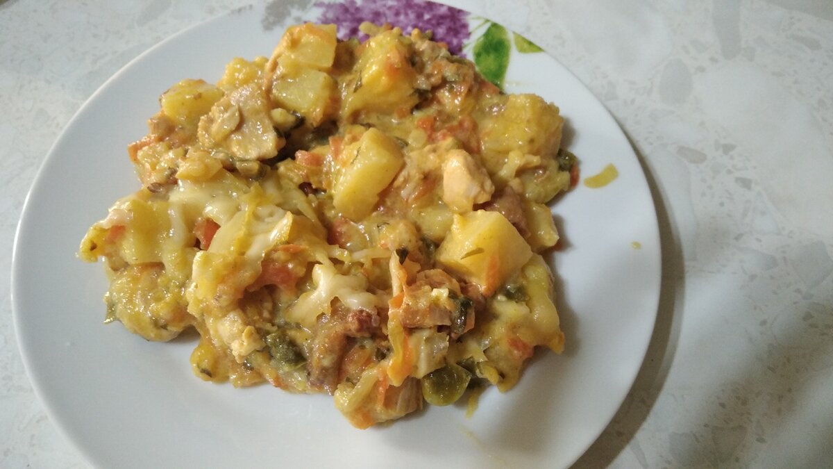Куриная грудка 2шт, картофель 3шт, половинку кабачка, морковь 1шт, лук 1шт , перец болгарский 1шт, грибы лисички 200гр, сметана, сыр.