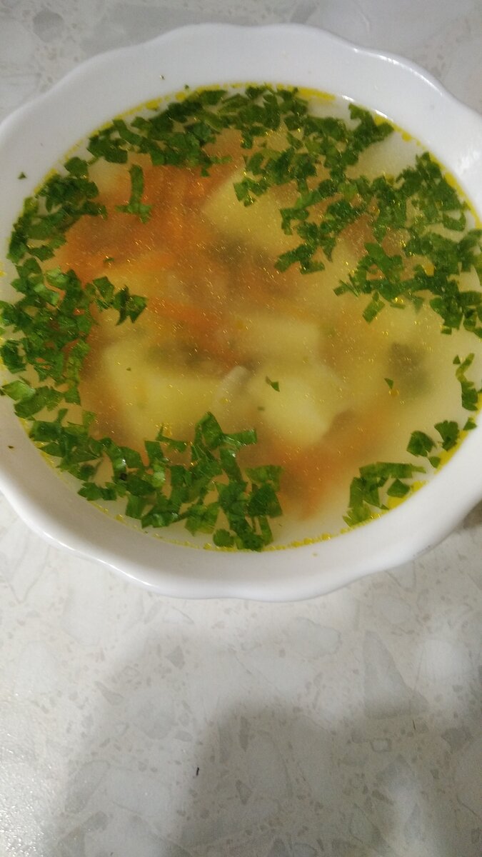 После мясо убираю на тарелку и закладываю овощи: лук, морковь, картофель. За 5 минут до готовности засыпаю паутинку. Зелень кладу после выключения газовой плиты. Даю настояться в закрытом виде минут 10-15. Суп готов. Это очень вкусно.