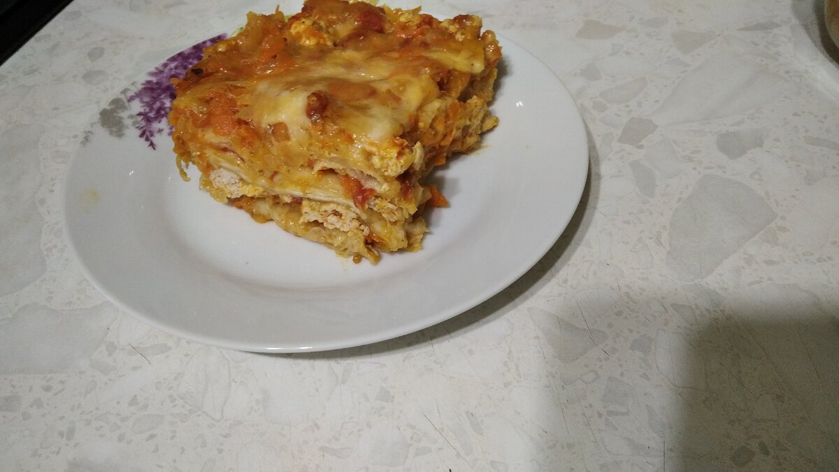 Курицу поджариваем на сковородке, добавляем овощи постепенно(лук, морковь, кабачки) тушим. Стеклянную форму смазываем маслом. Разрываем лист лаваша на не большие фрагменты и укладываем в форму. Затем выкладываем 1/3 поджарки и засыпаем сыром. Затем снова лаваш и снова поджарка и сверху посыпаем сыром. Так повторяем 3 раза. Закрываем фольгой. В разогретую духовку до 180 гр ставим на 45 минут. При подаче можно украсить зеленью. Попробуйте приготовить это очень вкусно.