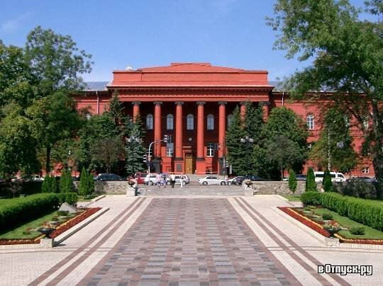 Основан Университет был в 1833 году указом царя Николая I на базе Кременецкого лицея и Виленского университета и назывался Киевским Императорским университетом св. Владимира. Царем же было утверждено штатное расписание и временный устав. Киевский университет был вторым, после Императорского Харьковского, университетом на малороссийской территории, и шестым университетом Российской империи. До 1842 года собственным помещением Киевский университет не располагал. Поэтому арендовались плохо приспособленные для учебного процесса приватные дома на Печерске. В 1838—1842 гг. под руководством профессора академии искусств Петербурга В. И. Беретти на необитаемой окраине старого Киева возвели громадный университетский корпус в манере русского классицизма, который первоначально был белым. Главное университетское здание (Красный корпус) является огромным замкнутым корпусом (длина фасада – более 145 м.) с двором внутри и окрашен в цвета наградной ленты ордена св. Владимира — черный и красный (черные