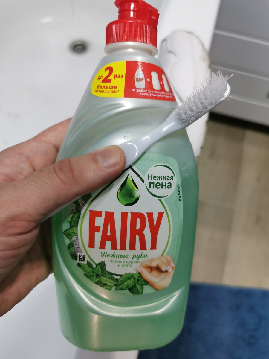Рано или поздно, а обычно это наступает неожиданно, белые кроссовки покрываются слоем пыли и грязи и приобретают неопрятный вид. Для того, чтобы освежить их необходимо либо протереть специальными салфетками для белой обуви, которые есть практически в каждом уважаемом магазине обуви, либо поставить на стирку в стиральной машине. А что же делать, если под рукой у вас нет салфеток для белой обуви и у вас нет времени, чтобы ждать пока отработает цикл в стиральной машине, а после ещё и придётся ждать пока ваши любимые кроссовки высохнут? Для того, чтобы быстро вымыть белую подошву кроссовок вам понадобится: Вот мои кроссовки с белой подошвой, которые я носил пару дней и они уже успели запылится, в таких было бы стыдно выходить на улицу. Для начала необходимо смочить зубную щётку и подошву кроссовок. Затем нанести небольшое количество Fairy на зубную щетку и растереть по всей подошве, при этом будет образовываться обильная пена и даже в самом начале вы уже увидите результат. Далее необ