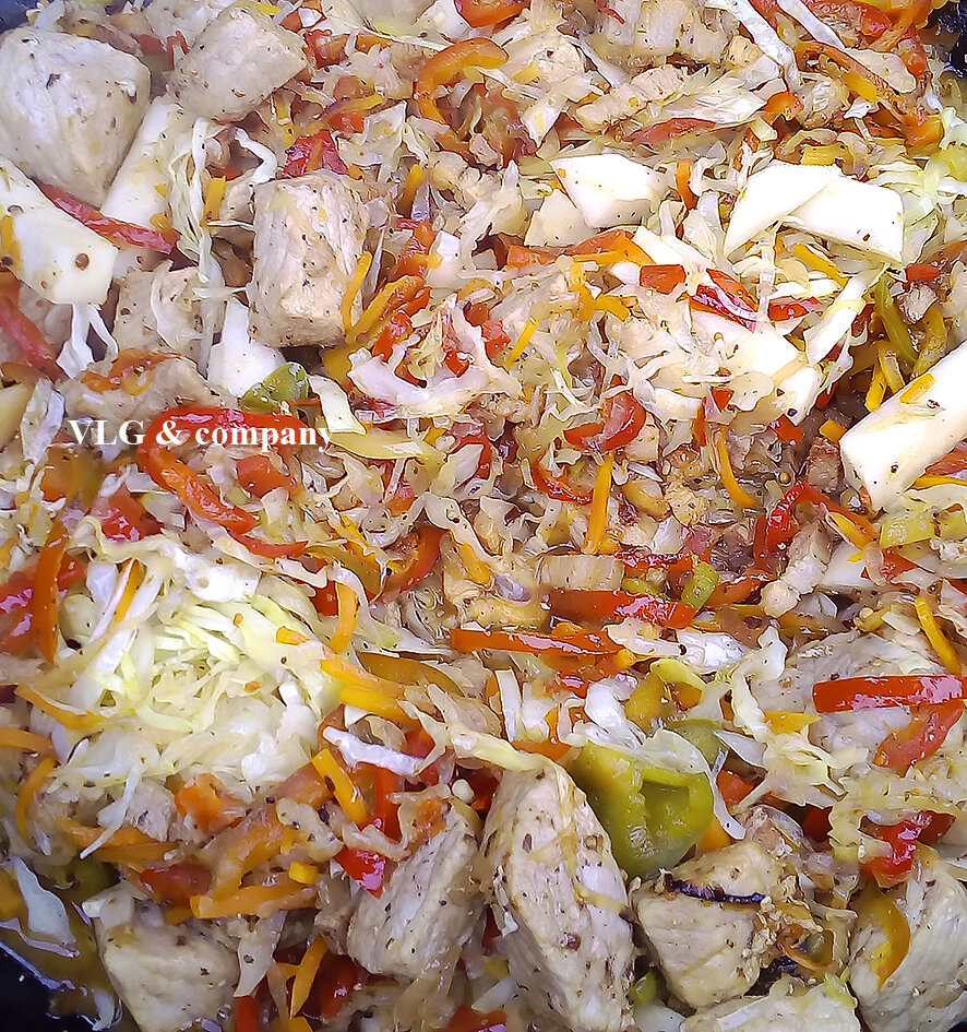 Мы взяли немного варено-копченой жирной грудинки и сырого карбоната. Лук, морковь, капуста, чеснок, репа и смесь перцев: острого и сладкого. Блюдо сытное, осеннее, поэтому набор овощей может быть очень разнообразным. Ну и, естественно, растительное масло, чтоб было полегче!)))