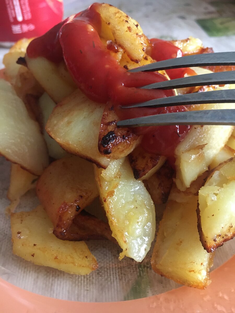 Нам понадобится 3-4 карт. Вначале чистим, а потом обязательно помыть Далее мы берём нож, начинаем резать в дольки . Как показано на рисунке ⬇️ Следовательно, мы отправляем на сковородку(за ранее нужно налить немного масла) ,далее кладём картофель Как только процесс пошёл, берём и мешаем Когда мы вначале жарим картошку, не стоит солить, потому что она будет давать сок ,жарим без крышки,если закроем будет тушиться Когда уже появляются золотые корочки, уже стоит добавить соль Прошло 5 мин смотрим и мешаем,каждые 7 мин стоит перемешать(уже нужно закрыть крышку) Уже когда начинает пригорать нужно всё время мешать «Можно использовать разную приправу» Вот и заключительный этап.Приятного аппетита!!!
