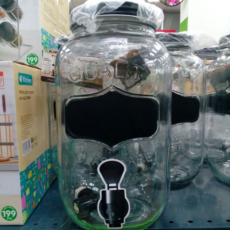 Самая креативная новинка этой недели - банка с краном. Банка с краном подходит для подачи разных напитков. Открываешь краник и наливаешь в стакан и чашку напиток, который находится в банке. Лучше всего это подходит для застолий в компаниях. Весело и оригинально. Для подачи на стол напитков используется кувшин, но он может опрокинутся и жидкость разольется, что случается нередко в шумных компаниях и на пикнике. С банкой все по-другому. Она закрыта и при опрокидывании жидкость не разольется и останется в банке. И еще это будет интересно детям. Она произведена из стекла в Китае. На сайте к банке прилагается подставка из металла, но я ее в магазине не увидела. Кухонная подставка для сковород Очень полезная вещь. У меня сковороды лежат в столе навалом друг на друге. С подставкой для сковород их можно расставить каждую отдельно на свою полочку и доставать их очень удобно, сразу видно, что берешь. Самая экзотическая новинка – прибор для нарезания ананаса. Все приборы разобрали, остался один.