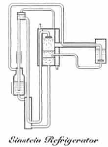 Разработкой собственного холодильника Эйнштейн занялся после трагедии, которая произошла с обычной немецкой семьёй в 1920 годах. Люди погибли из-за утечки диоксида серы, который вылился из неисправного холодильника. Тогда Эйнштейн разработал устройство без движущихся частей, то есть холодильник без компрессора. Вместо опасных охлаждающих жидкостей в нём использовалось безвредное спиртовое топливо. Несмотря на то, что холодильник Эйнштейна был готов к запуску в массовое производство, его дебют так и не состоялся. В 1930 годах патент выкупила фирма «Электролюкс», которая посчитала, что холодильники с компрессором эффективнее, и притормозила внедрение инновации. В 2008 году сотрудники Оксфордского университета разработали собственный концепт холодильника Эйнштейна, который будет работать на солнечных батареях. Электричество устройству не требуется, так как энергия нужна только для подогрева насоса.