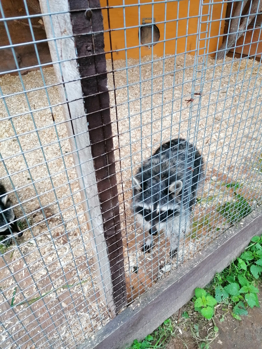 Мы приехали, туда минут за 30, увидели ухоженную территорию, где в вольерах живут гуси, крольчиха с крольчатами, утки и даже еноты.