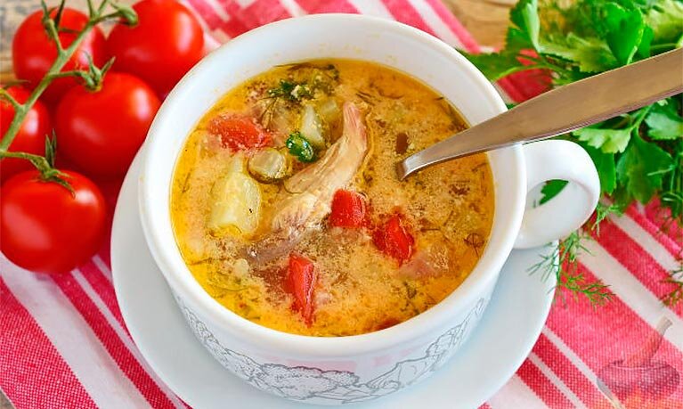 Ингредиенты: 1. Куриный окорочок - 250гр. 2. Картофель – 1шт. 3. Помидор – 1шт. 4. Лук репчатый – 1 шт. 5. Сметана – 3 ст.ложки 6. Зелень 7. Специи * Всё это на 1,5л воды Способ приготовления: 1. Куриный окорочок отварить на медленном огне, обязательно убирать пенку. 2. Достать окорочок, остудить и разделить на небольшие кусочки. 3. В кипящий бульон закинуть картошку. 4. Через минут 5 закинуть помидорку. 5. Сделать зажарку из лука. 6. Высыпать зажарку в бульон и добавить курицу. 7. Добавить сметану. 8. Добавить зелень и через минуту выключить. * Дать постоять хотя бы 10 минут.