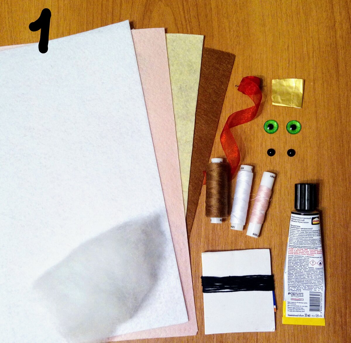 1. Для работы нам понадобятся: фетр белый, розовый, коричневый, бежевый. Нитки швейные под цвета фетра. Синтепон. Нитки мулине черные. Лента шириной 1см. Искусственные глаза и две черные полубусины. Кусочек золотой фольги и кусочек картона. Клеевой пистолет или клей "Момент Кристалл".