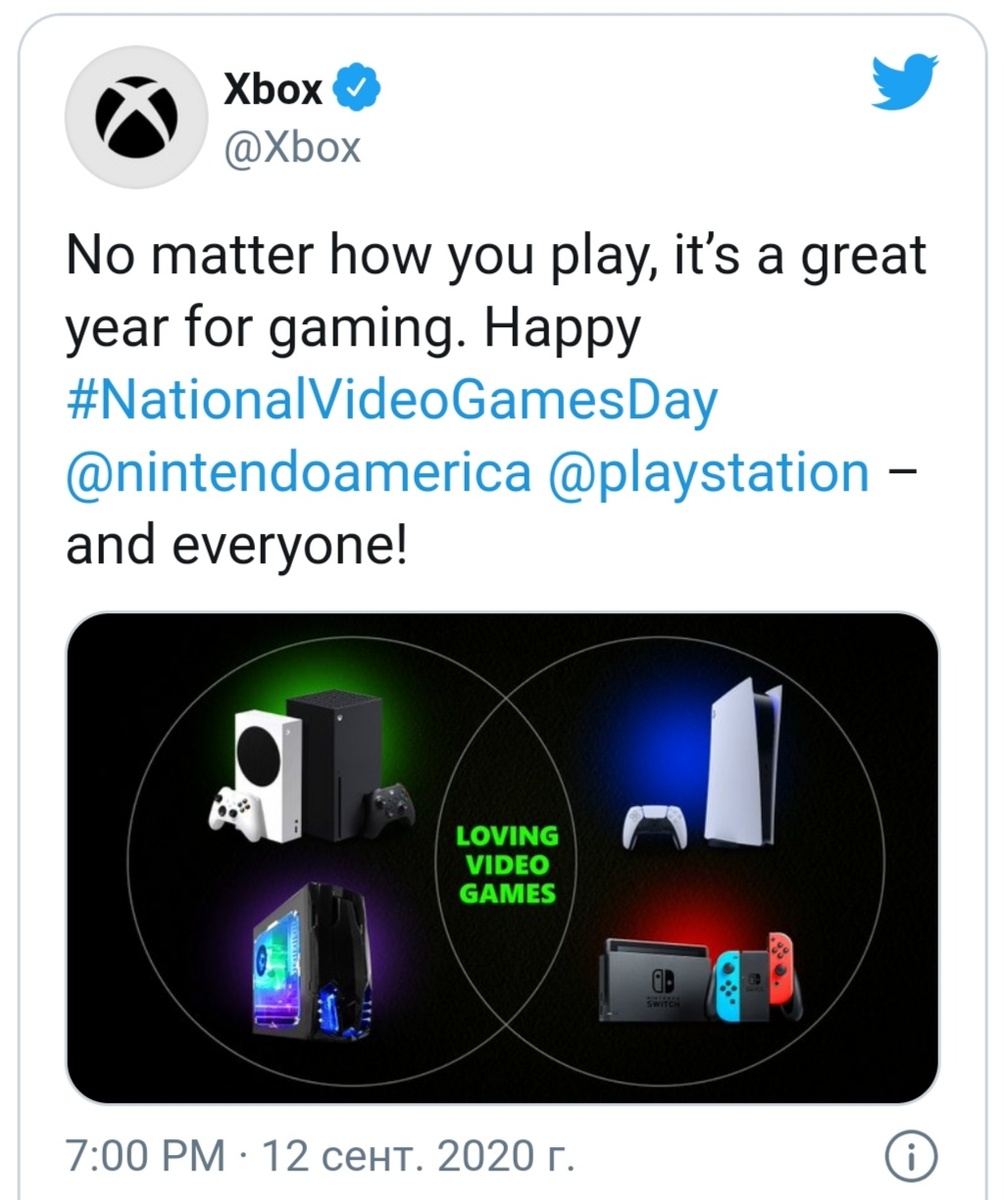 Компания Microsoft решила поздравить Sony и Nintendo (и PC, правда у данной платформы нет какого-то определенного владельца) с национальным днем видеоигр, который принято отмечать в США 12 сентября.
