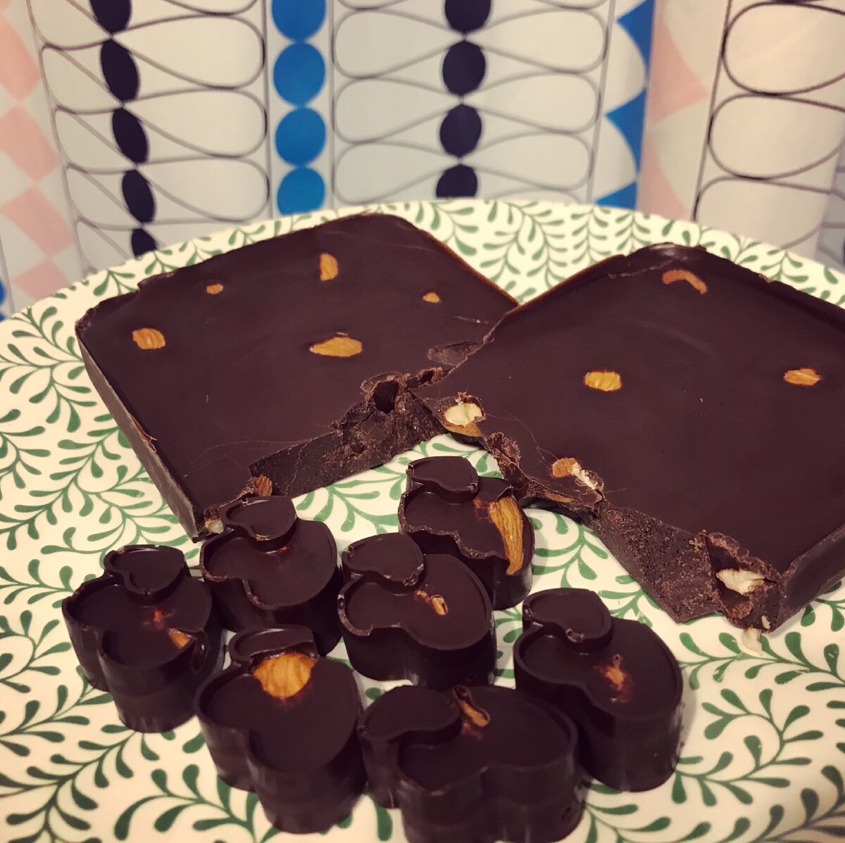 Очень легко приготовить: я заказала на Озон какао и какао-масло. Растопила примерно 100 гр какао и 50 гр масла на водяной бане. Добавила для сладости сироп топинамбура и разлила по формочкам с миндальными орешками. Безумно вкусный горький шоколад получился.