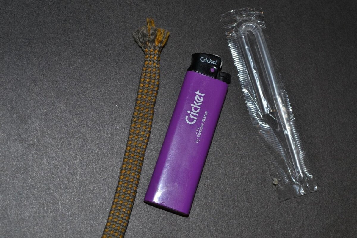 Вставляю шнурок в трубочку. На расстоянии около 5 см от трубочки провожу несколько раз пламенем от зажигалки. Если поднести ближе можно сжечь пластик, он запузырится и лопнет. Придется начинать сначала. Готово. Отрезаю лишнюю махру до трубочки и еще раз прижигаю самый кончик.