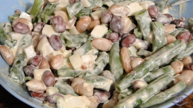 Ингредиенты: 100 грамм красной фасоли, 100 грамм белой фасоли, 100 грамм зелёной фасоли, 2 яйца, 1-2 зубчика чеснока, майонез — для заправки, соль, перец — по вкусу.