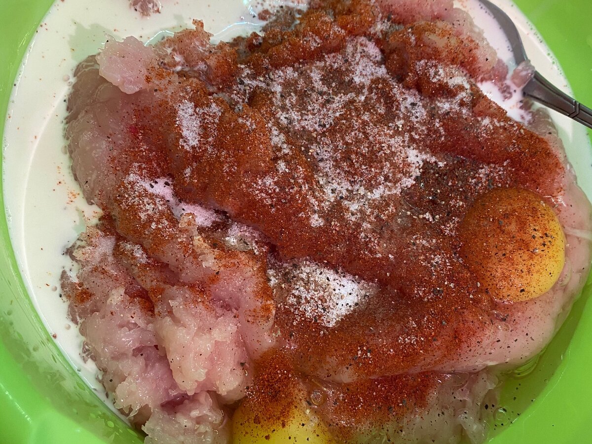 У меня был готовый куриный фарш, в него добавляем яйцо, паприку, соль, перец, молоко и тщательно перемешаем.