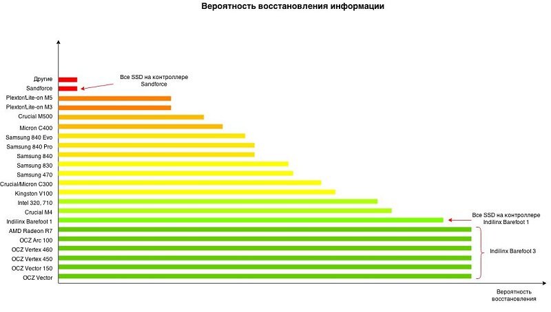 Предлагаю сегодня немного поговорить о восстановлении информации с неисправных SSD накопителей. Но для начала, прежде, чем мы познакомимся с технологией спасения драгоценных кило- мега- и гигабайт, прошу обратить внимание на приведенную диаграмму. На ней мы попытались расположить наиболее популярные модели SSD согласно вероятности успешного восстановления данных с них.