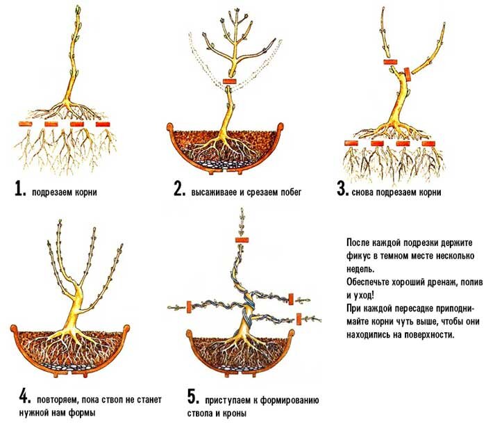 Нужную форму корням придают путем многократной обрезке основного побега. Растение растет не вверх, а в ширину. У молодого фикуса укорачивают корни и побеги и высаживают его в широкий контейнер с хорошим дренажем.