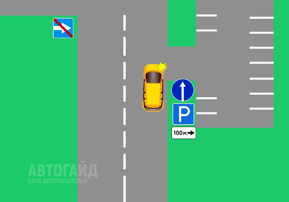 Водитель желтой машины хочет остановиться, он ищет свободные места, но их нет. И вот, как по заказу, виднеется знак - парковка, снизу табличка 8.1.3. Осталось только повернуть и остановиться. Однако помимо знака стоит еще и другой - 4.1.1 "движение прямо", причем как раз перед заездом на стоянку. Можно ли в таком случае заехать на парковку по ПДД или это будет нарушением?