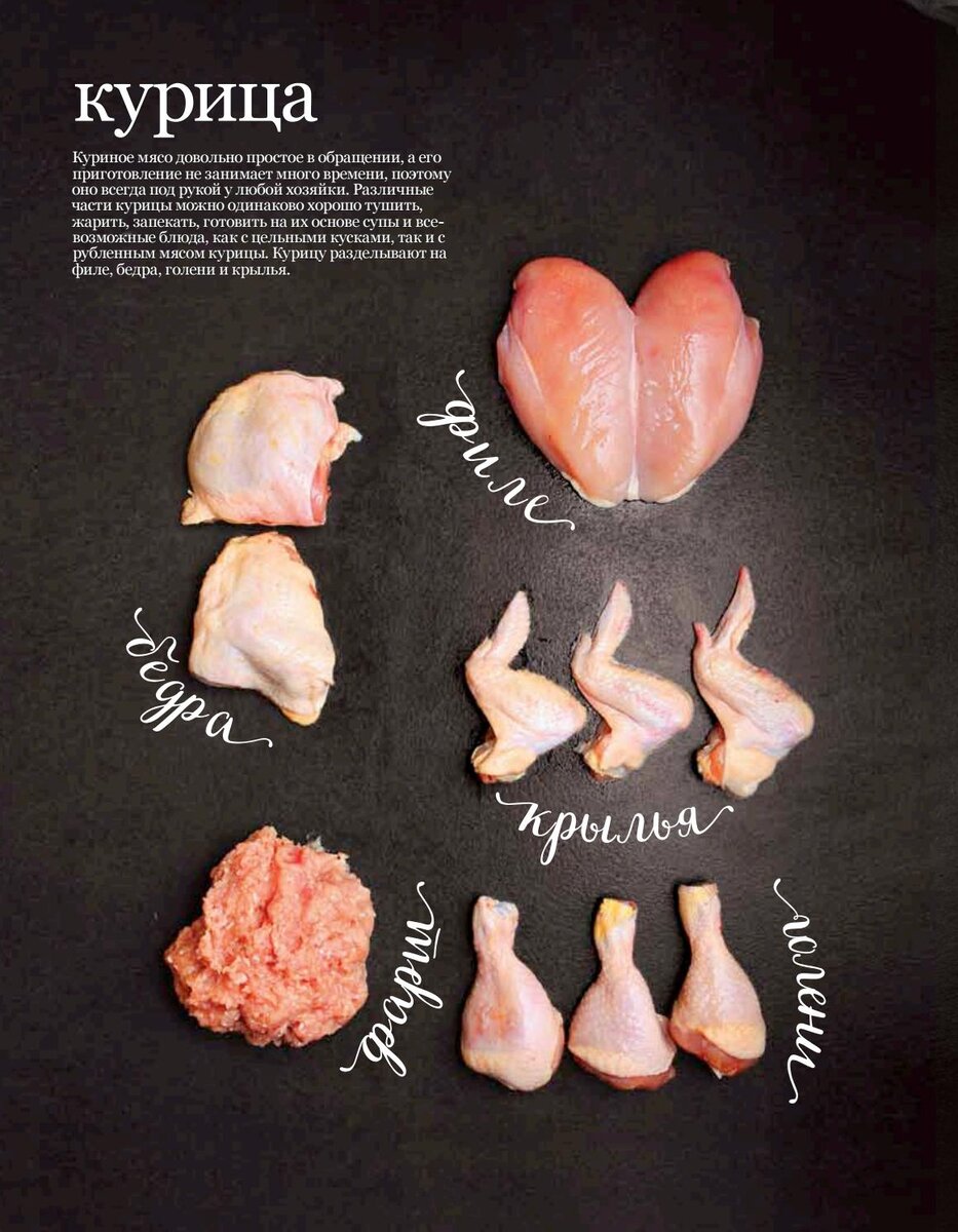Куриная тушка делится на следующие части: Самыми жирными частями курицы являются кожа, крылья, гузка и окорочка. Правильная разделка курицы: как разделать курицу на порционные куски Кому неохота вникать в нюансы разделки, можно дать только один совет: запекайте или отваривайте тушку целиком — вопрос будет решен. Остальным ;t, кому это интересно, стоит продолжить экскурсию в мир разделки. Вариантов разделаться с куриной тушкой существует несколько. Если делить куриную тушку на части по классической схеме, то в результате получится 8 кусков. Основные способы разделки птицы Разделка без отходов Используется, когда необходимо из тушки сделать большее количество полуфабрикатов в запас и получить ассорти на бульон. Разделка производится на средние кусочки. Разделка порционная Курица делится па порционные куски, все лишние выбрасывается. Такой вариант хорош, когда предполагается запекать или жарить. Для такой разделки потребуется набить руку. Она может получиться не с первого раза. Только уп