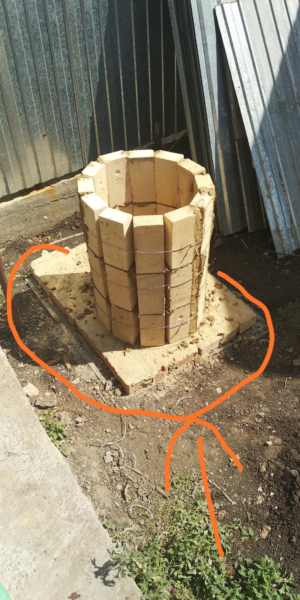 - Далее выкладываем кирпич вот таким образом , размер был взят от двухсот литровой бочки её внутренего радиуса . Так же укладываем кирпич на шамотную глину и связываем вязальной проволокой для дальнейшего высыхания .