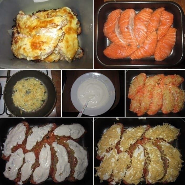 🌟Филе форели (или сёмги), приготовленное в духовке.❤️ Ингредиенты: - филе рыбы - репчатый лук - сметана - майонез - сыр - растительное масло - соль. Приготовление: 1. Разогреть духовку до 230-250 градусов.Нарезать рыбу порционно ,выложить на противень,немножко посолить. 2. На сковороде в масле обжарить лук до золотистого цвета,так же немножко посолить. 3. Смешать майонез,сметану и ,опять же,немножко посолить.)) 4. Сыр натереть на крупной тёрке. 5. На кусок рыбы выложить лук-сметану с майонезом-сыр и в духовку. 6. Минут через 15-20,когда сыр запечётся до коричневой корочки-готово!