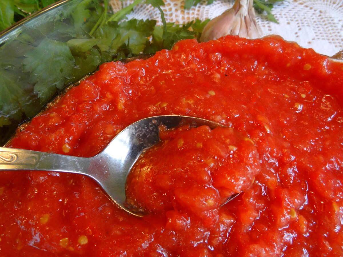 Приготовление домашней аджики. Что понадобиться: Помидоры — 3 Килограмма. Лук — 1 Килограмм. Морковь — 1 Килограмм . Сладкий перец — 1 Килограмм . Острый перец — 2-4 Штук (по вкусу) Головка чеснока — 3 Штуки. Соль — 3 Ст. ложки Сахар — 3/4-1 Стакана (по вкусу) Уксус — 1 Стакан Растительное масло — 1 Стакан Зелень — 1 Пучок (базилик, петрушка, укроп) Данных ингредиентов хватит примерно на 15 порций аджики Сам процесс приготовления: Помидоры вымойте, залейте кипятком, сделав предварительно небольшие надрезы. Через пару минут остудите под проточной водой и очистите. Очистите лук, морковь и сладкий перец. Лук, морковь, сладкий перец и помидоры пропускаем через мясорубку. Добавляем соль и сахар, вливаем растительное масло. После закипания уберите огонь до минимума и оставьте томиться примерно на часик. Минут через 30-40 добавьте измельченный острый перец. Час прошел, аджика уварилась. Добавьте пропущенный через пресс чеснок и измельченную зелень. . В конце влейте уксус и ещ