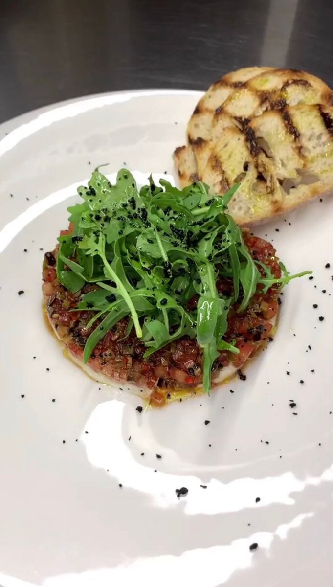 Нарезать мелкими кубиками помидоры без мякоти и кожи. Добавить маслины, красный лук, каперсы и чили перец. Брызнуть апельсином, добавить соевый соус и оливковое масло и перемешаем. Возьмем круглую форму и на дно кладем сыр страчателла, далее наши нарезанные кубики, руккола сверху, оливковое масло, присыпем крошкой от маслин сушеных, пару крутнов и все готово.