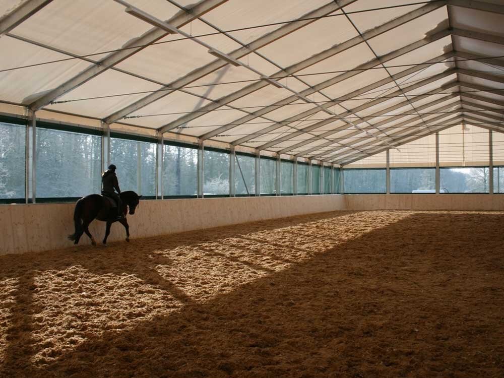 Наличие крытого конного манежа позволяет вести тренировки круглый год, независимо от климатических условий. Здания из легких металлоконструкций обшиваются сэндвич-панелями, что обеспечивает высокую энергоэффективность и позволяет снизить затраты на обогрев помещения в холодное время года. Такие конструкции дешевле, чем капитальные здания, на строительство даже крупного объекта в среднем уходит 2-3 месяца.