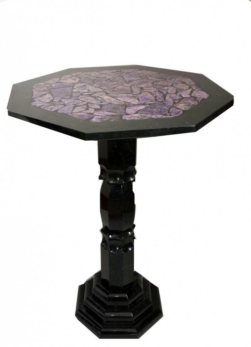 Столы изготавливается из самых различных пород камня, начиная со змеевика и кончая редчайшими породами мрамора, оникса, лазурита, малахита, яшмы , офиокальцита и других полудрагоценных камней.