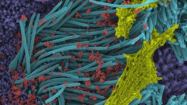 Исследователи Университета Северной Каролины опубликовали изображения клеток, инфицированных вирусом SARS-CoV-2. Снимки имеют поразительное качество. Уникальные снимки создала Камилль Эре (Camille Ehre) и её команда из лаборатории Медицинской школы Университета Северной Каролины. Изображения, полученные при помощи мощного микроскопа, позволили увидеть, как вирус SARS-CoV-2 размножается на поверхности клеток дыхательных путей человека. Изображения были опубликованы в издании New England Journal of Medicine. Вирусные частицы, показанные красным цветом, готовы к выходу из организма человека и заражению новых людей. Как объяснила сама Эре, она хотела показать на наглядном примере, насколько интенсивной может быть инфекция дыхательных путей вирусом SARS-CoV-2. И действительно, на снимках видно, насколько большое количество новых вирусных частиц производит и высвобождает всего одна клетка дыхательной системы человека. Для