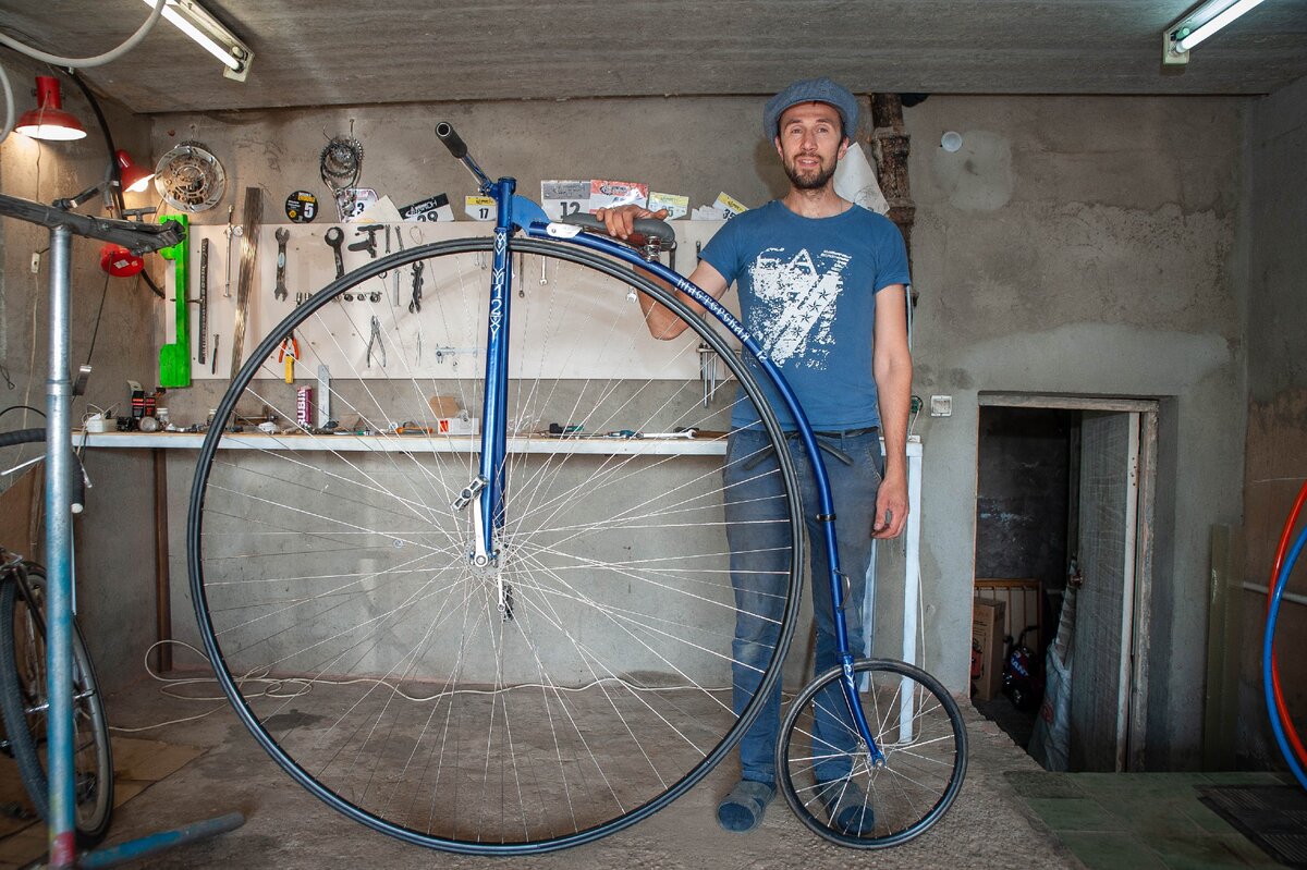 «Да, он больше обычного даже по меркам прошлого. Если посмотреть на фотографии таких велосипедов, сделанные в XIX веке, можно увидеть, что большое колесо обычно находилось на уровне подмышки человека», — поясняет создатель.