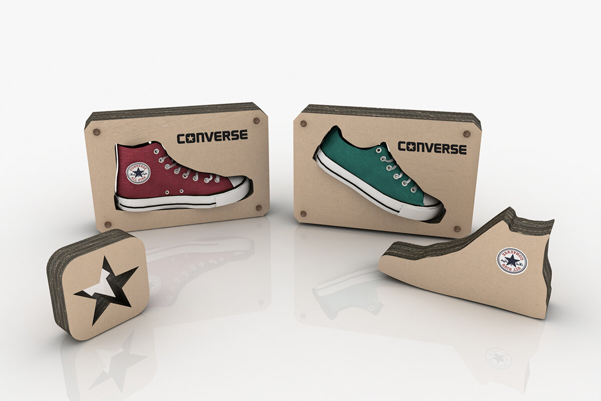 Витрина является комбинацией из упаковки и дисплея с минимумом печати и отражает девиз компании Converse - «Расход материалов равен нулю».