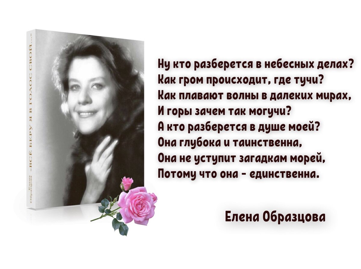 🎵 Она никогда не считала себя поэтом. Стихи выходили из-под пера самостоятельно, по велению души, чему сама певица глубоко удивлялась, называя себя «проводником». Проводником от кого и к кому? Елена Образцова, казалось бы, все рассказала о себе в музыке, полностью реализовавшись как гениальная певица, талантливая актриса, вдумчивый педагог… Но, видимо, остались в сердце частички божественного предназначения, которые можно выразить лишь в рифмованных нежных строках, пронизанных страстью, горечью и восторгом… «Никогда не знаю, о чем буду писать, и почему сажусь писать – тоже не знаю…» – вспоминала Елена Васильевна, – «как будто кто-то мне диктует. Стихи – моя стихия». Читая строчки из сборника «Все беру я в голос свой…», замечаешь и шероховатости, и некоторое несовершенство формы, но стихи настолько искренни, глубоки и поразительно эмоциональны, что эта неотшлифованность придает им дополнительную прелесть и чистоту. Ведь что такое настоящая поэзия? Это, прежде всего, загадка, рожде