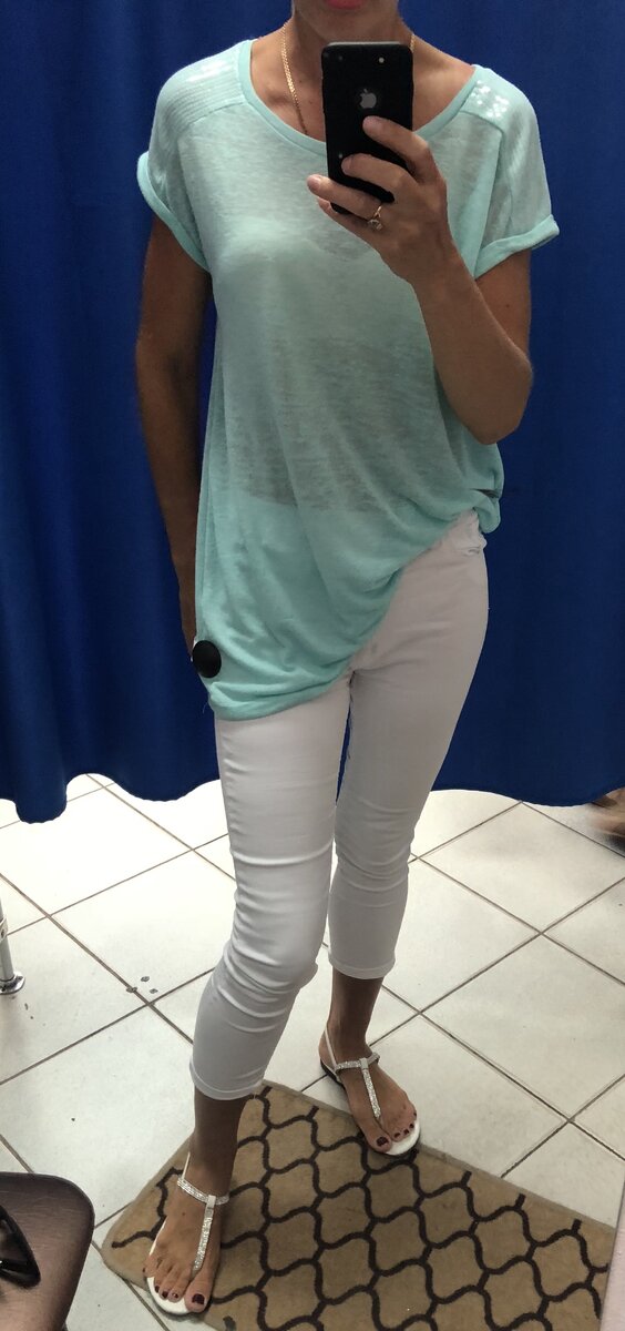 Удлинённая футболка с пайетками на плечах. Меня привлёк конечно же цвет. Но оказалась вещь для меня слишком длинной.