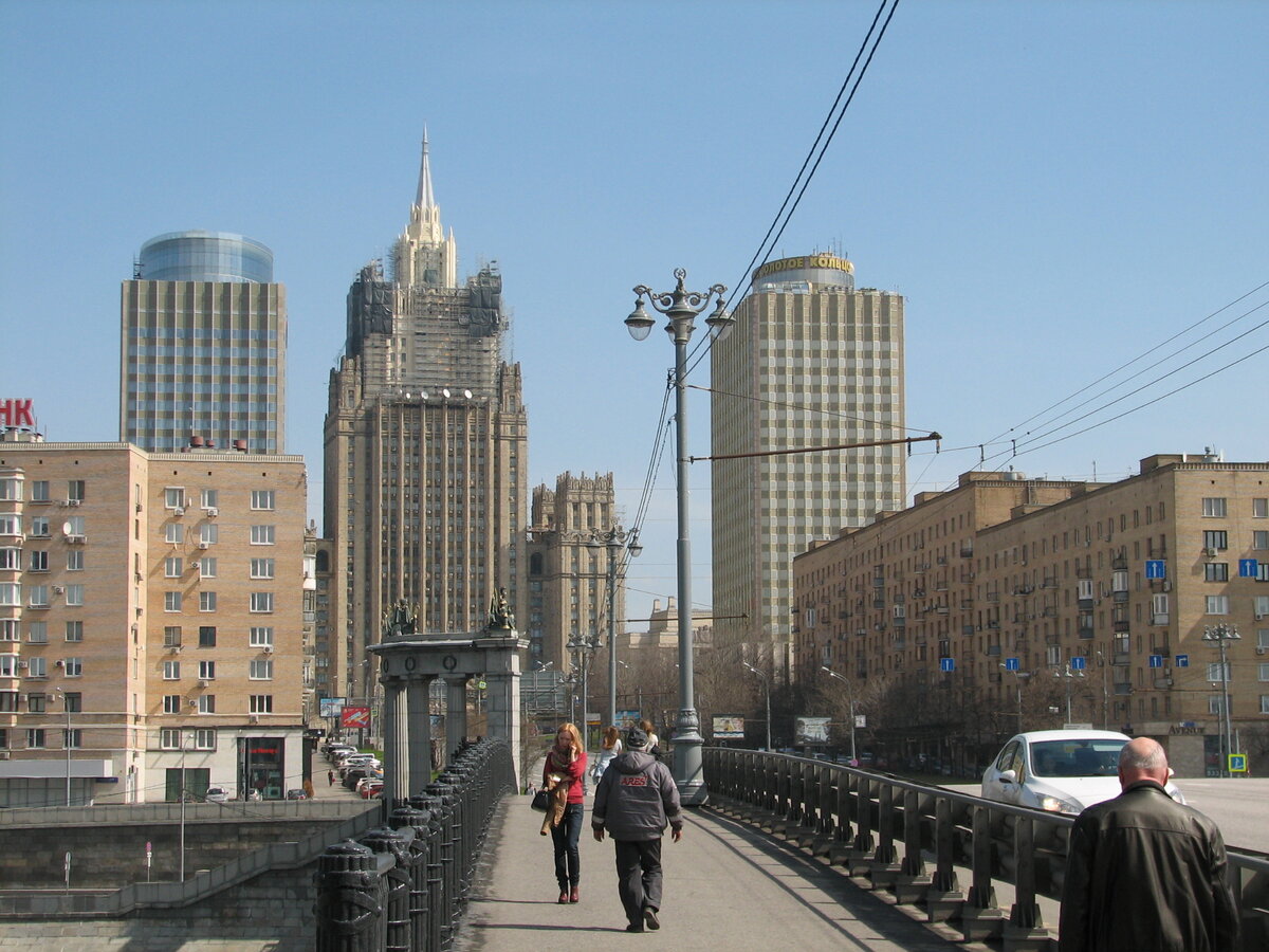 Что можно посмотреть в Москве за четыре часа, два из которых ты планируешь общаться с родственниками, которых сто лет не видел, и пообщаться очень хочешь. Наверное, ничего. А еще нужно переместиться с вокзала на вокзал. Вот мы ничего и не смотрели. К тому же и четырех часов даже для обзорной экскурсии по Москве – маловато. Поэтому, взяв такси от Трёх вокзалов до Европейской площади, покатили мы по Садовому кольцу с Ленинградского вокзала на Киевский. Получилась небольшая прогулка. Несмотря на субботнее утро, движение на Садовом было довольно плотное. Зато это давало хорошую возможность неспеша рассматривать город и даже периодически что-то фотографировать в открытое окно. Благо погода была подходящая, солнечная. После питерских двух градусов тепла московские двадцать два воспринимались совсем по-летнему. Так в мой объектив попали пять из семи канонических московских сталинских высоток, к которым я был неравнодушен с детства, Москва-Сити и еще несколько интересных видов. Москва, с её эклектичностью, производит впечатление квартиры, в которой не закончена уборка: окна и полы уже помыли, пыль местами протёрли, а вещи по местам ещё не расставили. К тому же в некоторых местах ещё и ремонт продолжают делать.
