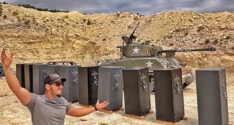 Мэтт с «Разрушительного ранчо» получил в подарок десяток сейфов и решил испытать их на прочность, зарядив по ним из танка. Современные стальные сейфы — это настоящее произведение искусства, призванное сохранить в неприкосновенности личные вещи своих владельцев. Фантастическая жароустойчивость, внушительные многослойные двери… В таком хранилище ваши ценности будут под защитой даже после большого пожара. А что насчет выстрела из танка? Увы, против мощи «Шермана» не устоит ни один портативный сейф из тех, что вы можете купить в магазине. Танковый снаряд рвет стальную обшивку и все слои защиты как карандаш, проходящий сквозь тонкую рисовую бумагу. Неутомимый Мэтт решил выяснить, удастся ли спасти свою жизнь, если спрятаться за целым десятком 300-килограммовых сейфов под прицелом танка — и результаты оказались впечатляющими: По итогам, при стрельбе в упор танк с легкостью пробивает 6 сейфов насквозь, после чего снаряд ощутимо вминает дверь седьмого так, что открыть его затем можно лишь с
