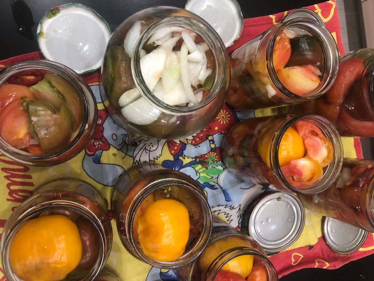 Банки стерилизуем,помидоры режем на крупные дольки:небольшие на 2 части,крупные-на четвертинки.Лук режем полукольцами,перец соломкой.