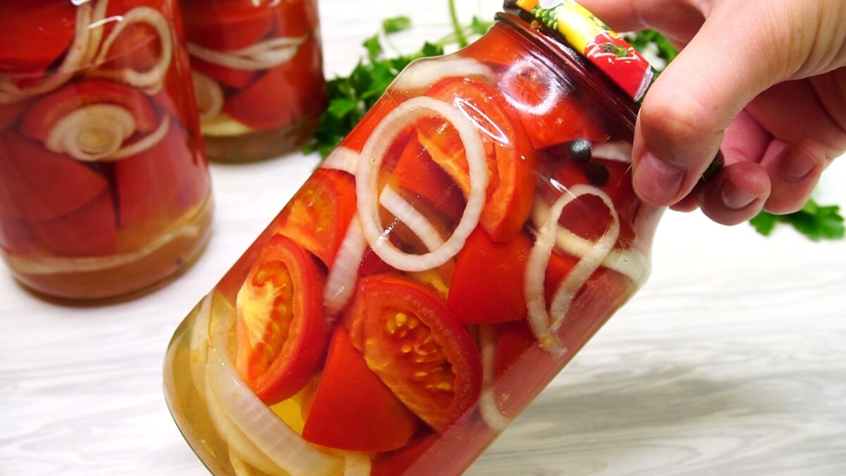 Укладываем в стерилизованные банки слоями лук помидоры, лук помидоры.