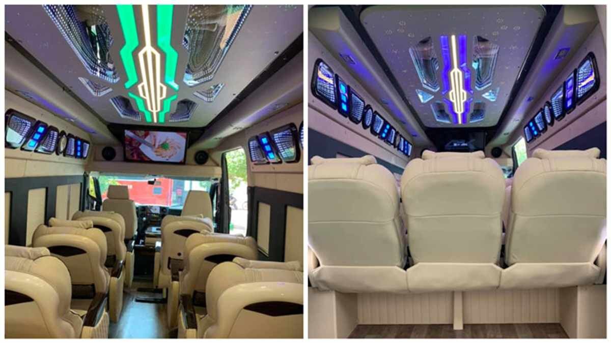 11-местный микроавтобус оснастили автоматической дверью, заниженную подножку, телевизор, комфортабельные кресла, потолок с зеркальными элементами и интерьерной подсветкой и многое другое. Стоимость таких доработок не оглашается.
