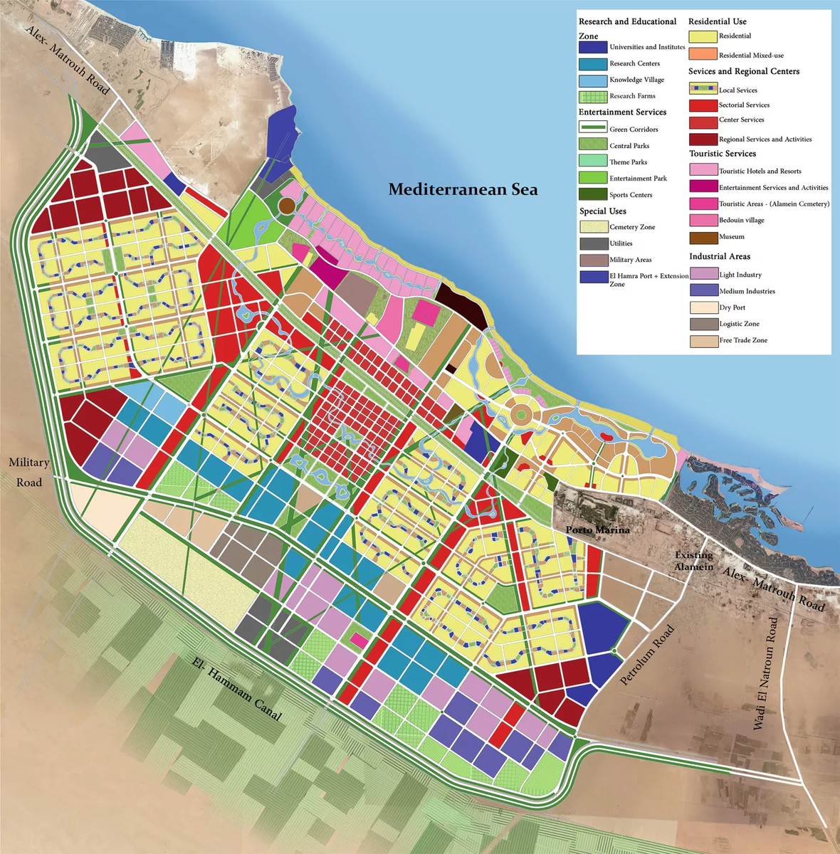 Новый курорт будет поражать воображение туристов роскошными небоскребами в стиле Дубай, многочисленными парками развлечений, магазинами и кинотеатрами. Инфраструктура Название новоявленного города – курорта Новый Аламейн-Сити. Находится он на северо-западе страны, в нескольких километрах от границы с Ливией и прибрежного Марса-Матрух. Правительство уже вложило миллиарды долларов в это строительство и продолжает вкладывать в город и сегодня. Вся территория города, общей площадью около 20 га, как бы поделена на секторы. Это собственно туристический район с гостиницами и отелями, зона развлечений, торговый квартал, а также исторический. Пока он представлен только военным кладбищем Аламейн и музеем, посвященном событиям Второй мировой войны. В дальнейшем здесь планируется открытие музея под открытым небом. Кроме собственно исторических объектов в этом районе будут поострены несколько гостиниц, парк развлечений, обустроена зона портовых услуг. Транспортная доступность Советник по СМИ