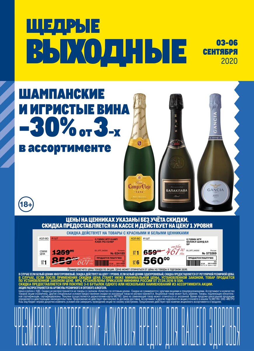 Прайс-лист акции МЕТРО на шампанские и игристые вина 3-6 сентября 2020 года (размер 35 Кб).