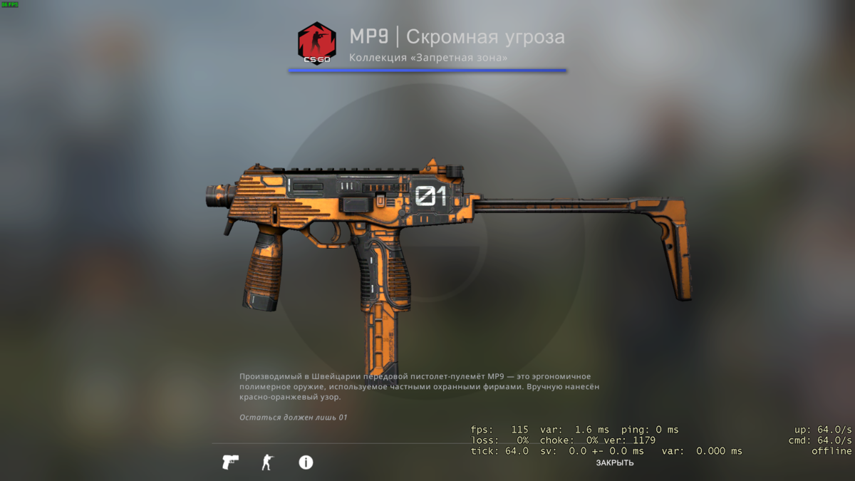 Открывает нашу подборку MP9 | Скромная угроза. Качество- после полевых испытаний. Цена начинается от 6 рублей. Вручную нанесён красно-оранжевый узор. Выпадает из кейса "Запретная зона".