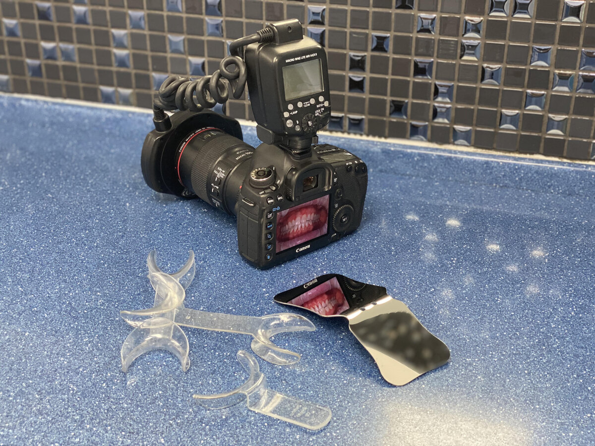 Для проведения фото протокола требуются фотоаппарат (Кэп), интраоральное зеркало и ретракторы (роторасширители).