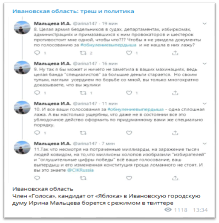 Telegram-канал «Ивановская область: треш и политика» заявлял об агрессивных и неадекватных высказываниях Мальцевой в Twitter относительно голосования по Конституции РФ.