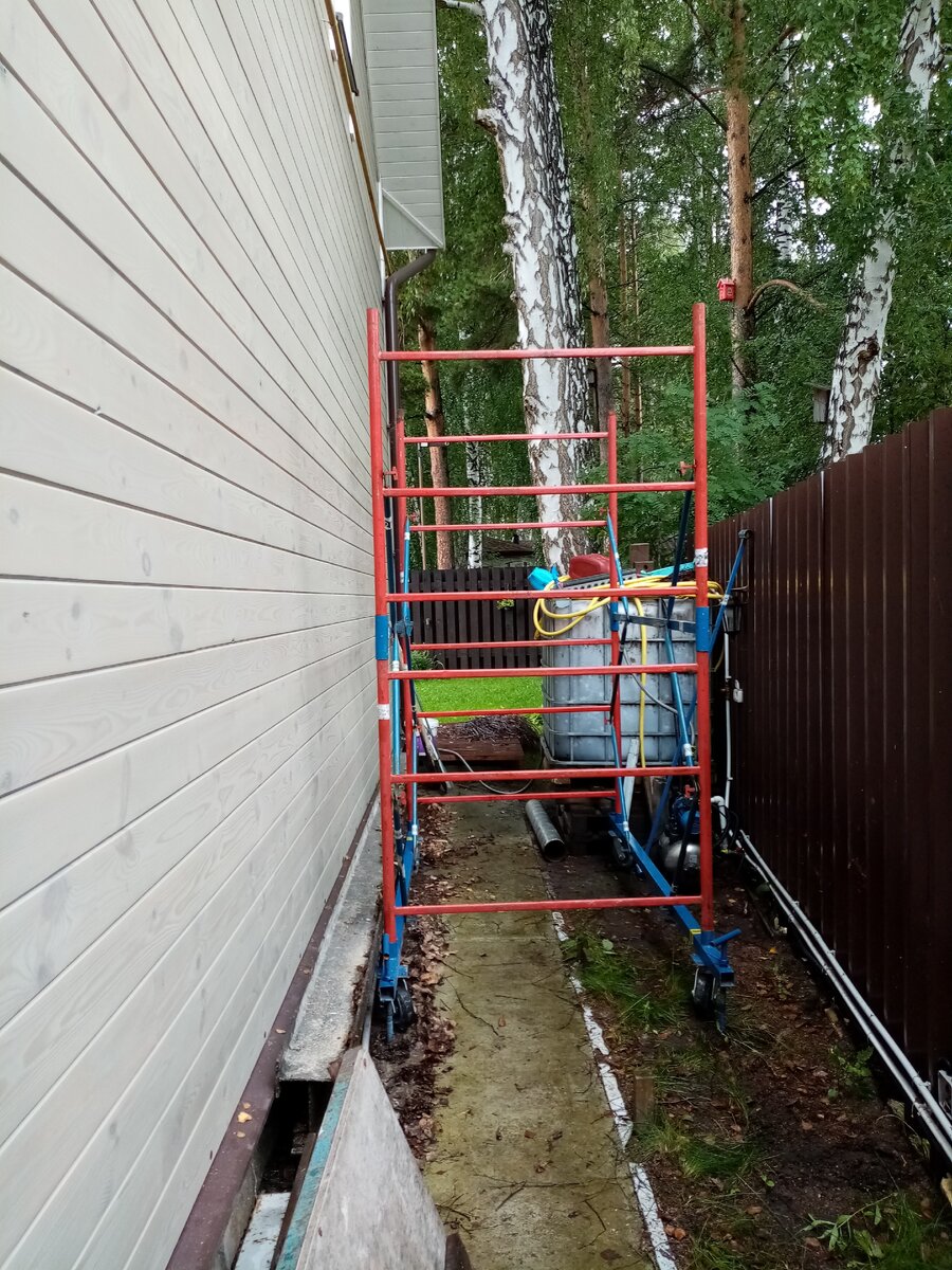 Дымоход нужно было собрать по фасаду дома, высота порядка 8 метров в коньке, дом и весь приусадебный участок, полностью готов, даже газон посеян, ни о какой авто вышке речь и не шла. Почесав репу и поняв, что лучше всего будет арендовать вышку туру, типа лесов.
