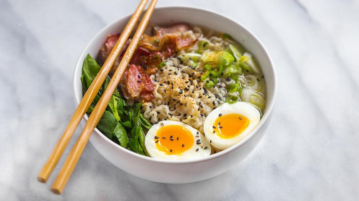Ингредиенты на 4 порции: 2 упаковки лапши быстрого приготовления; 1 куриное филе; 1,5-2 л горячей воды; 4 отварных яйца. 1 маленькая луковица; 1/3 пакетика соуса терияки; 1/2 ч.л. сушеного имбиря; 1 ч.л. сушеного чеснока; 5-6 шт. перьев зеленого лука; горсть кунжута. 1. Репчатый лук очистите и измельчите, курицу порежьте кубиком среднего размера. Яйца отварите вкрутую. 2. Разогрейте на сковороде немного растительного масла, выложите сначала лук, обжарьте до мягкости. Потом добавьте кусочки филе. Жарьте их до полуготовности, периодически помешивая. Добавьте чеснок и имбирь. 3. Чтобы курица приобрела золотистый оттенок и пикантный вкус, добавьте соусы. Влейте сначала соевый, перемешайте, потом терияки и вымешайте еще раз. Готовьте несколько минут. 4. . Влейте воду, уменьшите огонь ниже среднего уровня и варите под кр
